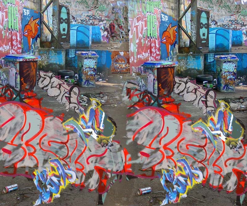 Erneut wurde das Videoband "Brachland" aufgeführt, daneben wurden grelle Graffiti- Szenen aus einem verlassenen Fabrikgelände dargestellt, die sich mit neuem Inhalt zur "Kunstfabrik" verwandelten. Die "Figures sonores au bord de la mer" waren dabei, wichtige farbenfrohe Arbeiten in der Alu-Dibond Technik aus den 1990er und 2000er Jahren. Einige große Anaglyphen mit ihren Sehbeobachtern waren zu sehen, daneben hingen ganz frühe Arbeiten aus den 1960er und 1970er Jahren.